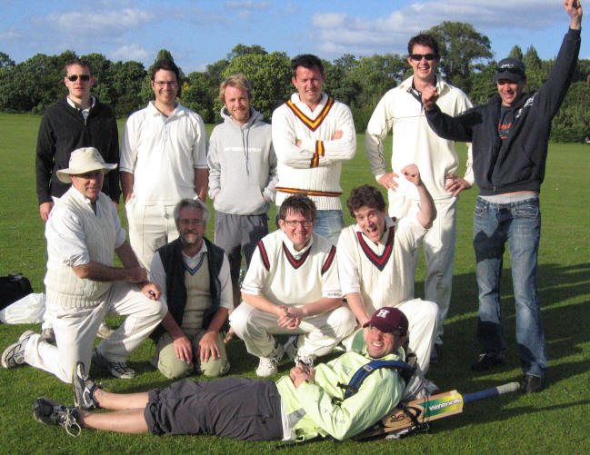 Dude batting line-up. Peter Frisby (bowling up the hill and into a